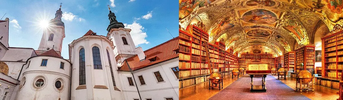 با این که تصور نمای چشم انداز زیبای شهر پراگ بدون مناره های چشم نواز کلیسای استراهوف کمی سخت است اما ارزشمندترین قسمت های این کلیسا و گنجینه های ناب آن در داخلش هستند. کتابخانه این کلیسا یکی از زیباترین کتابخانه های جهان است که در آن بیش از ۲۰۰ هزار جلد کتاب وجود دارد که ۳ هزار جلد از آن ها در نسخه اصلی خطی هستند. بیشتر شهرت این کلیسا به کتابخانه معروف، زیبا و ارزشمندش است، کتابخانه ای که از دو سالن تشکیل شده که با یک راهرو به هم مرتبط هستند. سالن مذهبی این کتابخانه با گچ بری های جذاب کتاب های دینی و هزاران نسجه از انجیل دارد.