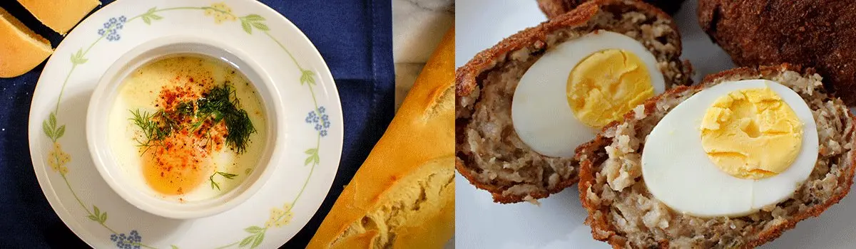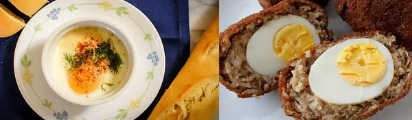 این غذا برای بریتانیا است و از اواسط دهه ۱۷۰۰ و حتی زودتر در این منطقه درست می شود. در این غذا پوست تخم مرغ آب پز را جدا می کنند و آن را لای گوشت سوسیس می گذارند و روی آن را با آرد سوخاری می پوشانند و سرخش می کنند تا طلایی شود. این غذا پروتئین خیلی خوبی دارد و به راحتی می توانید آن را با خود به بیرون ببرید و در پیکنیک ها استفاه کنید.