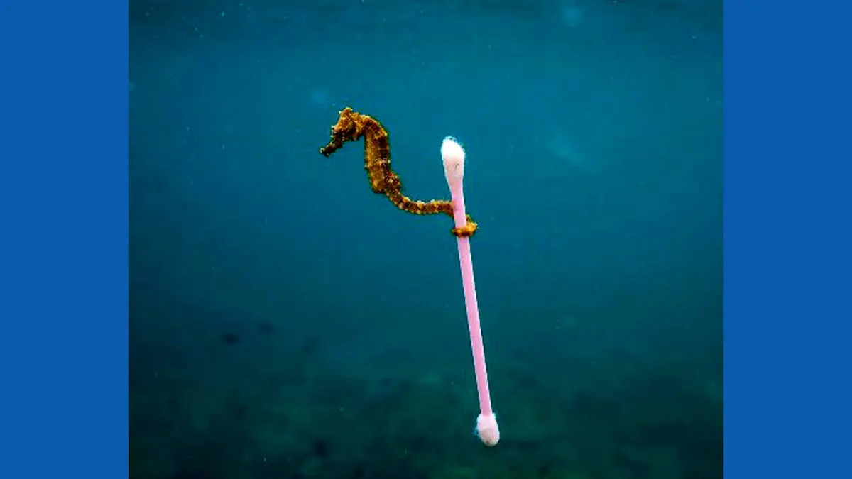 این عکس در آبهای اندونزی ثبت شده و اسب دریایی را نشان میدهد که گوشپاککنی را با خود میبرد. در پشت عکس آن لکههای سفید هم تکههای پلاستیک معلق در آب هستند.