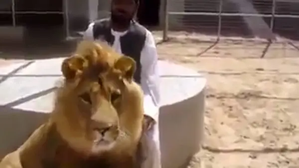 رکنا: یک مرد در این ویدئو با شیری که از قفس بیرون آمده شروع به بازی و سر به سر گذاشتن می کند.