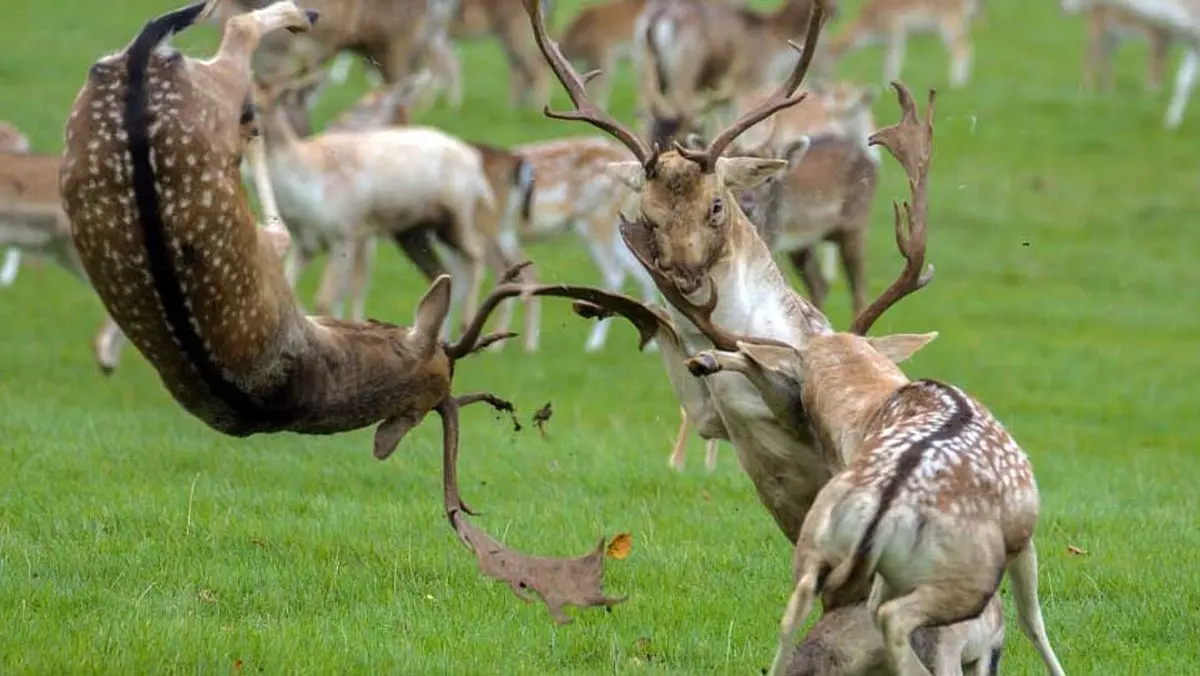 «استیو بل» عکاس 57 ساله در حین تماشای گوزن ها در پارک «هالکام » نورفولک جدال این حیوانات را قدرت نمایی این حیوانات برای جفت یابی و مشخص کردند قلمروشان می داند
