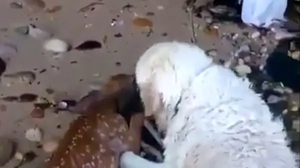 تلاش سگ مهربان برای نجات بچه گوزن در دریا + فیلم