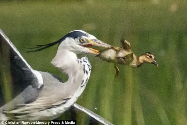 به نقل از دیلی استار، اردک مادر که در حال ماهیگیری بود با حمله حواصیل غافلگیر شد اما بی ثمر به دنبال جوجه اش و حواصیل بال بال می زند.