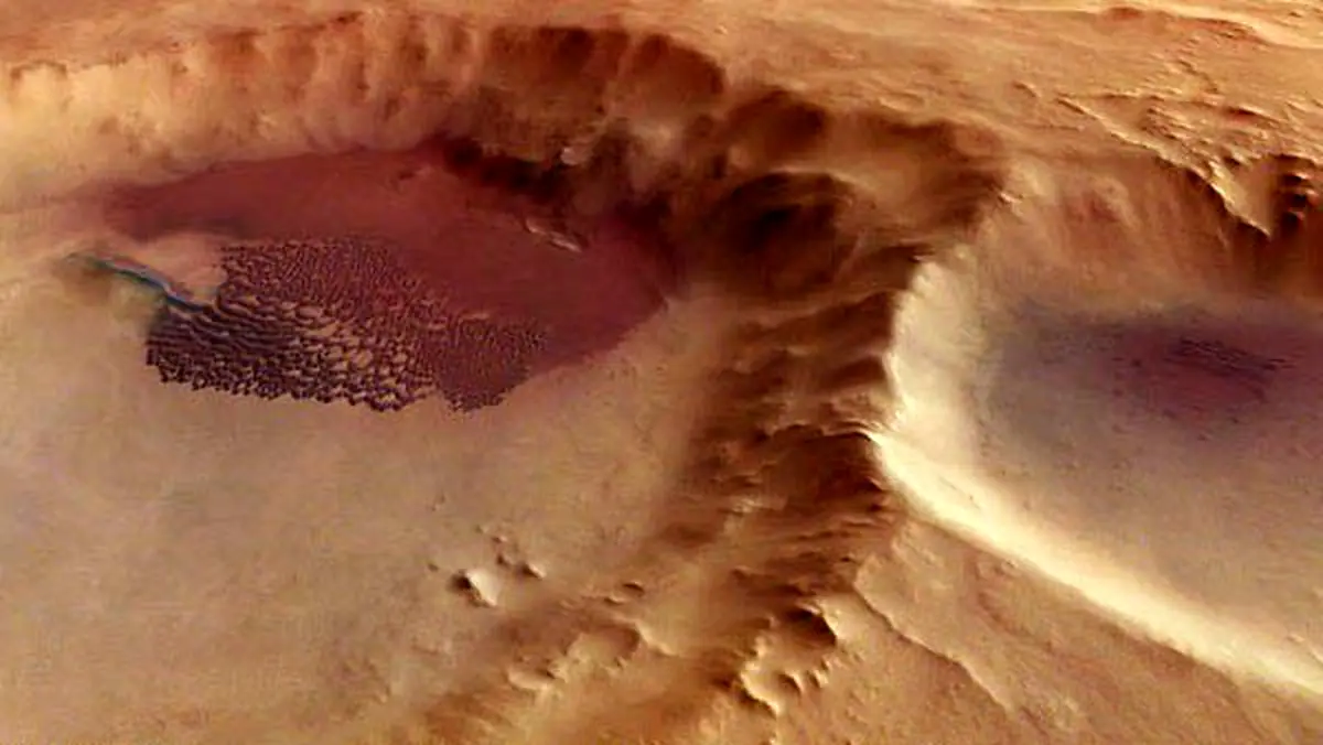 از سوی دیگر این مدارگرد سالها تصاویری عالی از مریخ را با موفقیت ارسال میکرده است. اگرچه در فضا هیچ جهت مشخصی وجود ندارد، قطب شمال سیارات معمولا در قسمت بالا و قطب جنوب در قسمت پایین نشان داده میشوند، اما این تصویر جدید با زاویه باز به ما یک چشمانداز "وارونه" با خط استوا در قسمت بالا و قطب شمال در قسمت پایین را ارائه میدهد.این تصویر با یک دوربین استریو با وضوح بالا هنگام حرکت مدارگرد از شمال به جنوب در 19 ژوئن گرفته شده است.