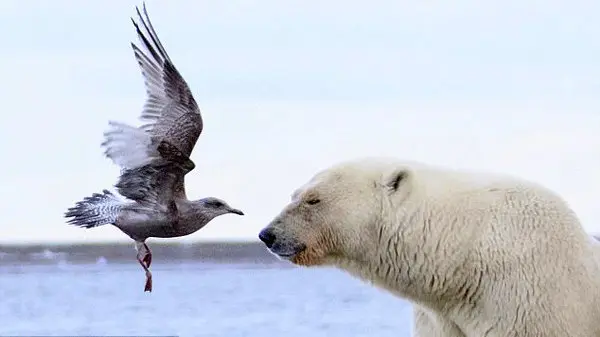 رکنا: عکاس حرفه ای حیات وحش تصویری شگفت انگیز از لحظه رودررویی یک خرس قطبی با مرغ دریایی گرسنه در آلاسکا گرفت.