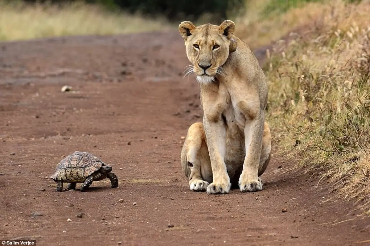 «سالیم ورجی» عکاس حیات وحش گفت :این شیر از اینکه یک لاک پشت تعقیبش می کرد تعجب کرده و رفتاری دوستانه با لاک پشت داشت.