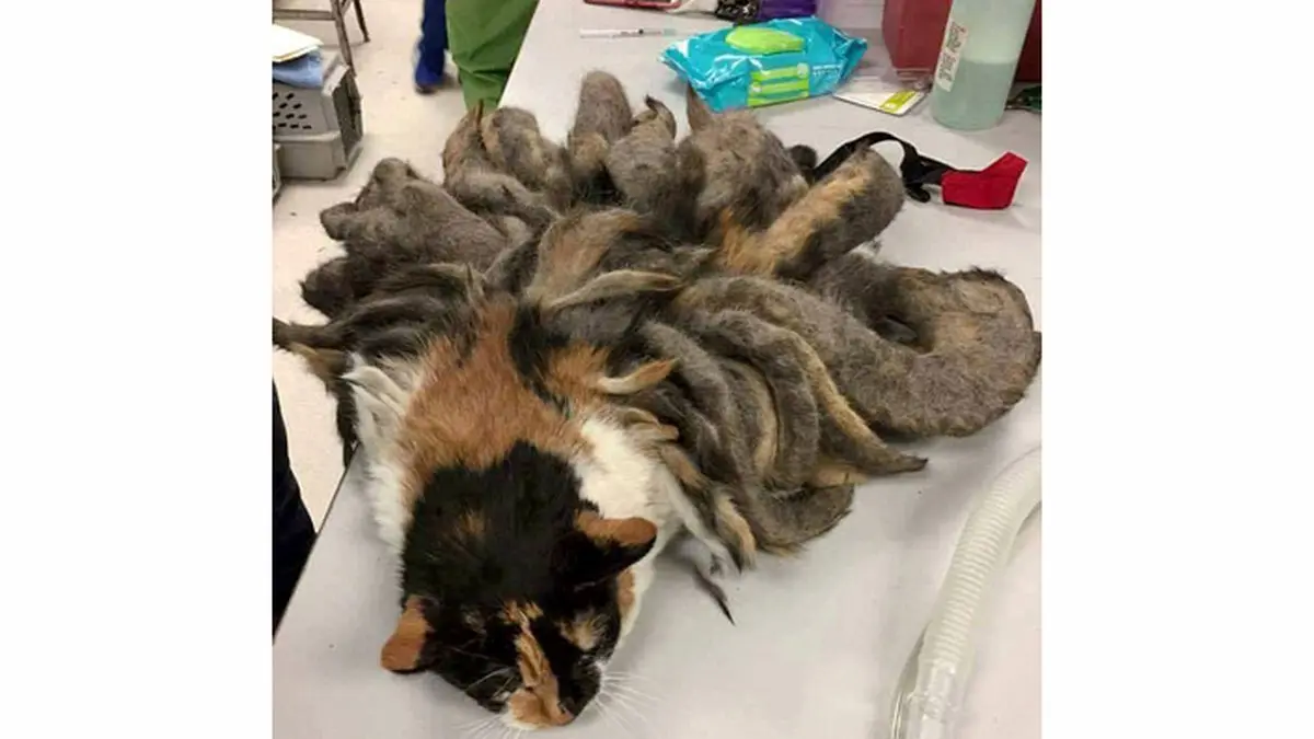 گفتنی است؛ افرادی که در کلینیک حیوانات پنسیلوانیا کار میکردند، مجبور شدند برای اینکه گربه را از این وضعیت رها کنند تمام موهای آن را با ماشین بتراشند.