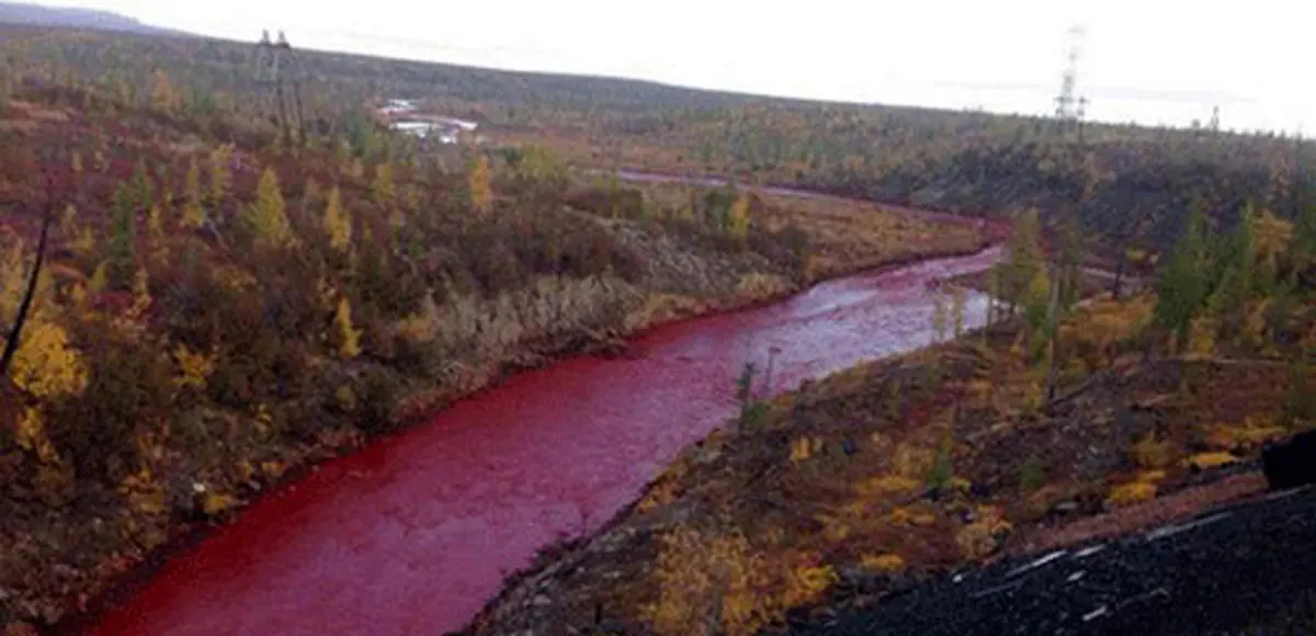 این تصاویر مرتبط است با یک رودخانه ی قرمز و خون آلود. مقامات روسیه دستور آغاز تحقیقات در مورد علت تغییر رنگ رودخانه “دالدیکان” را در شهر “نوریلسک” صادر کردند. این شهر در قسمت شمالی روسیه و محدوده قطب شمال واقع شده است و دارای کارخانه بزرگ تولید نیکل می باشد.