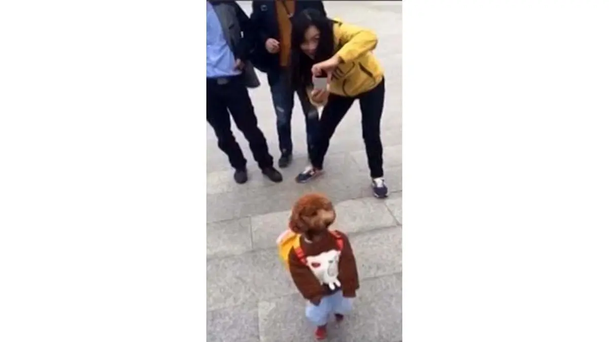 سگ آموزش دیده براحتی روی دو پای خود راه رفته بطوری که اگر کسی صورت او را نبیند تصور می کند یک دانش آموز واقعی در حال حرکت است.