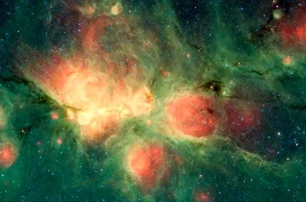 تلسکوپ فضایی اسپیتزر این تصویر را ثبت کرده که در آن حباب هایی عظیم در منطقه تشکیل ستاره ها دیده می شود. دور این حباب های قرمز رنگ، ابرهای سبزی وجود دارند. گاز و غبار درون سحابی به شکل ستاره فروپاشی می شود. این ستارگان احتمالا گازهای پرفشار اطراف خود را گرم می کنند. به این ترتیب گازها در فضا منبسط می شوند و حباب هایی به وجود می آورند.