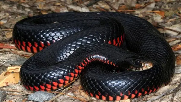 به نظر می رسد که رنگ قرمز نشانهی مرگ آور بودن جانداران است. این نوع مار که بومی شرق استرالیا است، می تواند تا ۲ متر رشد کند. پوست سیاه به این جاندار کمک می کند تا در شب پنهان شده و طعمهی خودش را که اغلب قورباغه ها هستند را شکار کند. اما شکم قرمز او مانند چراغ نئون روشن و مشخص است. زهر نیش این مار موجب مرگ سلولهای پوست میشود و اگر پادزهر به سرعت استفاده نشود موجب از کار افتادن کلیه و مرگ می شود.