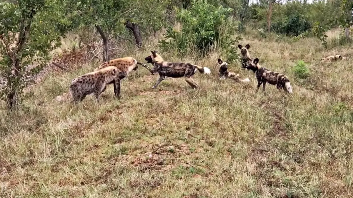 دستهای از سگهای وحشی و کفتارها در حیات وحش آفریقا رودرروی یکدیگر قرار گرفتند و سگهای وحشی با پنجههای خود ضرباتی به سر و صورت کفتارها وارد کردند.