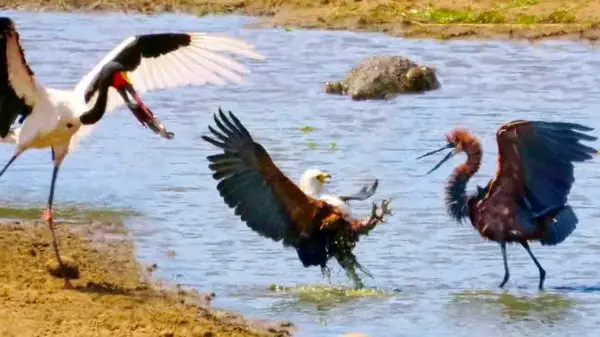 در رویدادی باورنکردنی ۳ پرنده گرسنه و یک تمساح بر سر یک ماهی بزرگ درگیر شدند. این اتفاق در پارک ملی کروگر آفریقای جنوبی رخ داده است.