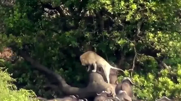 یک شیر سفید پس از اینکه توسط یک گله بزرگ گاومیش محاصره شد، مجبور شد برای ایمنی از تنه درخت بالا برود.