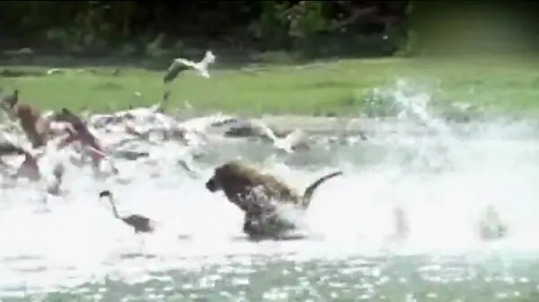 در این ویدیو میبینیم که یک بابون گرسنه به دسته فلامینگوهایی که درون رودخانه قرار دارند حمله میکند و موفق به شکار یکی از آنها میشود.
