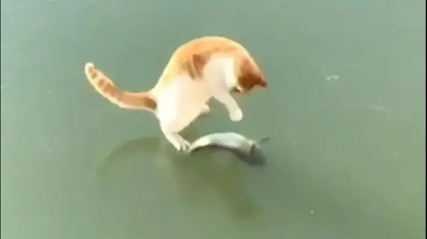 تقلای گربه برای ماهی یخ زده رو ببینید / فیلم