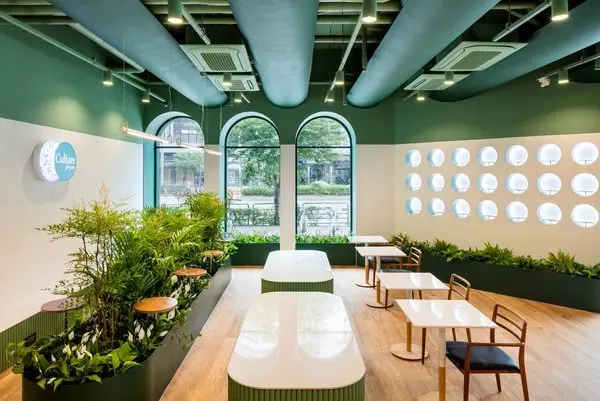 از رنگ سبز با تناژ رنگی مختلف برای ایجاد شبیه سازی مناسب با جنگل در تمام قسمت ها به کاربرده شده همچنین از رنگ سفید برای توازن بیشتر در فضا استفاده شده است.یک باکس بزرگ سبز رنگ،در مرکز این کافه با گیاهان متفاوت قرار داده شده که توجه هرشخصی به خود جال می کند،همچنین باکس هایی با سایز کوچکتر دورتا دور کافه طراحی شده که به مراجعه کنندگان احساس نشستن در فضای باز یک جنگل را داشته باشند و لذت تجربه پیک نیک را در دامن طبیعت تجربه کنید.بر روی دیوار سمت راست ورودی کافی شاپ،21 باکس گرد،برای نمایش مواد اولیه غذایی EROM طراحی شده،پایین این دیوار نیز، باکس گیاهان قرار گرفته که تاکیدی بر تازگی آن ها داشته باشد و با سایر قسمت ها هارمونی مناسب ایجاد شود.خواندنی های رکنا را در اینستاگرام دنبال کنید.
