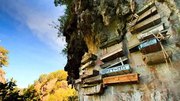 اگر در شهر ساگادا در فیلیپین می خواهید به دیدار مردگان بروید باید به جای اینکه روی زمین بدنبال آنها بگردید باید به بالا نگاه کنید. مردم این منطقه رسمی متفاوت دارند ، آنها مردگان خود را در تابوتی می گذارند و به دیواره های صخره ها متصل می کنند.