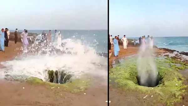 آبفشان و فواره طبیعی آب در ساحل چابهار / فیلم