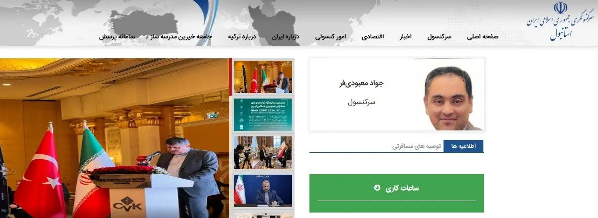 ساعات کاری کنسولگری ایران در استانبول: از دوشنبه تا جمعه از ساعت ۸:۳۰ تا ۱۲:۰۰ به غیر از روزهای تعطیل است.