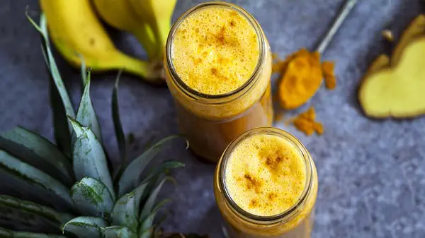 دو فنجان آناناس ، یک موز رسیده ، یک قاشق چایخوری پودر زردچوبه یا 2.5 تا 5 سانت ریشه زردچوبه تازه ، یک گره ریشه زنجبیل تازه ، اندکی فلفل سیاه به تازگی آسیاب شده برای افزایش جذب کورکومین در بدن ، یک فنجان شیر نارگیل