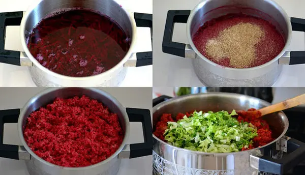 طرز تهیه: در ابتدای کار، چغندر را رنده کرده و با یک پیمانه آب روی اجاق قرار دهید تا بجوشد. بعد از اینکه مواد به جوش آمدند بلغور را اضافه کرده و هم بزنید. اجازه دهید تا آب کامل بخار شود. بعد از خشک‌شدن مواد، ۱۰ تا ۱۵ دقیقه بگذارید بماند، سپس مواد باقی‌مانده را اضافه کنید. این مدت استراحت‌دادن باعث می‌شود تا چغندرهای شما کمی پف کند. بعد از یک ربع استراحت، کاهو و پیازچۀ ریزشده را اضافه کنید. در آخر هم کمی نمک، روغن زیتون و آب لیمو بریزید. می‌توانید برای خوشمزه‌تر‌شدن غذا از گردو نیز استفاده کنید. چهارمین غذای رژیمی ساده هم آماده شد. حالا می‎‌رویم سراغ پنجمین و آخرین غذای رژیمی.