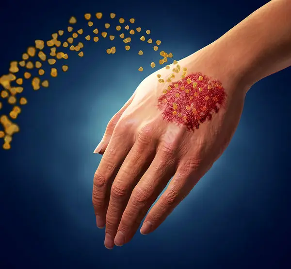سوریازیس خال خال (Guttate psoriasis) موجب شکل گیری زخم های کوچک و قرمز رنگ می شود که تنه، بازوها، و پاها را پوشش می دهند. این دومین نوع شایع سوریازیس است.
