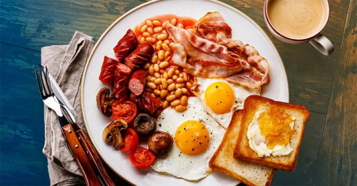 سوسیس، قارچ و گوجه‌ها را به همراه بیکن و لوبیا در بشقابی مناسب بچینید. نان تست را داخل بشقاب بگذارید و تخم مرغ‌ها را روی آن بچینید.