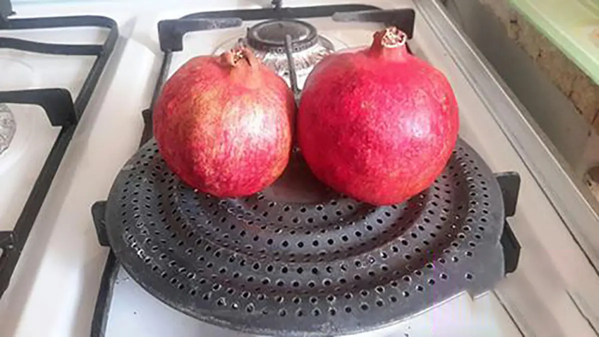 یک عدد انار را روی شعله پخش کن با حرارت خیلی کم قرار بدهید تا آهسته داخل خودش به مدت 20 دقیقه بجوشد و پخته شود. برای ورود به کانال تلگرام ما کلیک کنید.