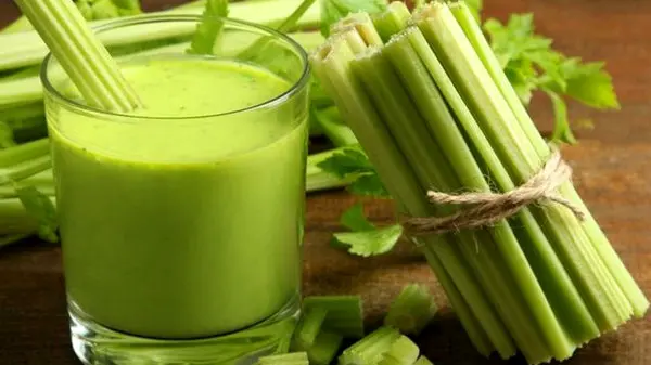 ۳ ساقه کرفس تازه را با یک خیار، ۲ عدد سیب، ۱ بند انگشت زنجبیل و نصف لیمو ترش تازه آب بگیرید و بنوشید.