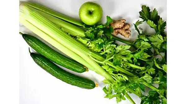 خیار و کرفس و دانه چیا و سیب ترش را به همراه برگ ریحان که سرشار از فیبر، پتاسیم و مقدار زیادی ویتامین B است در میکسر ریخته و کاملا باهم مخلوط کنید.