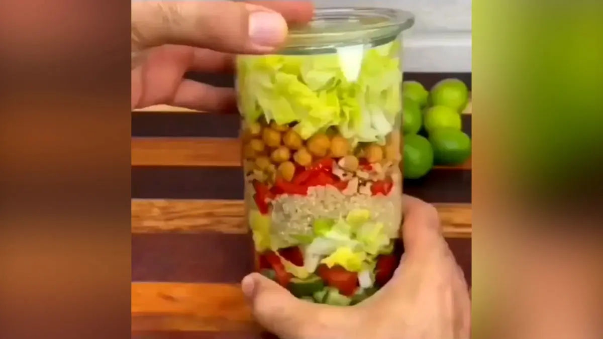 این سالاد به رژیم غذایی شما خیلی کمک می کند. ابتدا خیارها را خرد کنید و در ظرف شیشه ای بریزید. سپس گوجه فرنگی ها را خرد و اضافه کنید. کاهوها را هم ریز کنید و به محتویات ظرف تان بیفزایید. در این مرحله باید کینوا های پخته و آبکش کرده را اضافه کنید. برای طعم سالاد به آن فلفل دلمه ای، زیتون سبز و گردو را اضافه کنید. خوشمزه ترین بخش این سالاد دوست کبد شما تفت دادن نخود پخته است و در آخر دوباره یک لایه کاهوی خرد شده در ظرف سالاد بریزید و در آن را ببندید و به مدت 10 دقیقه در یخچال بگذارید.