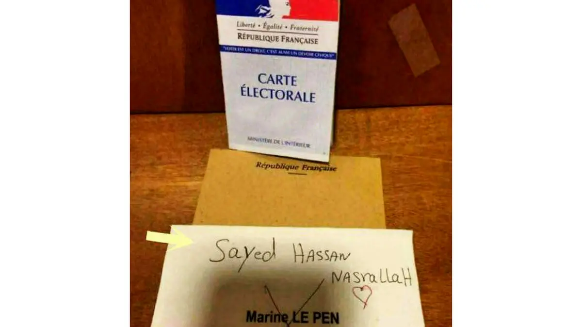در جریان انتخابات ریاست جمهوری فرانسه فردی با خط زدن نام مارلین لوپون یکی از نامزدهای انتخابات نام سیدحسن نصرالله دبیر کل حزب الله لبنان را یادداشت کرد.