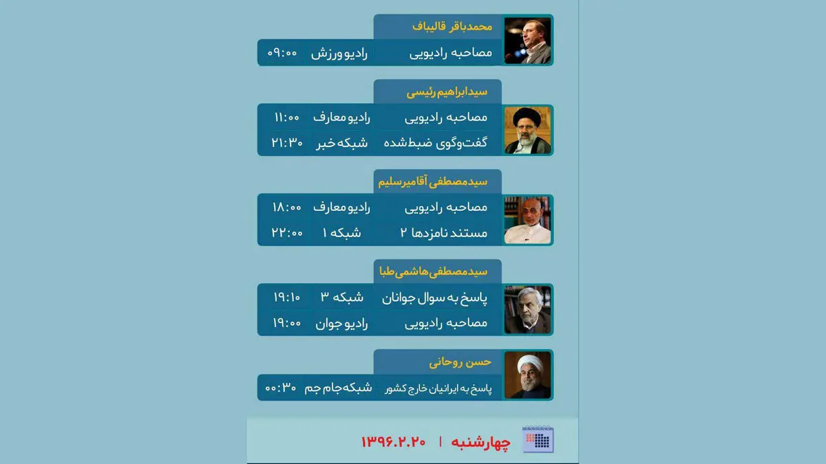 زمان پخش برنامههای تبلیغاتی امروز نامزدهای انتخابات ریاست جمهوری که از صدا و سیما پخش می شود.