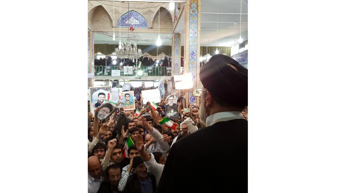 مردم حاضر در حسینیه اعظم پرچم ها و پلاکاردهایی با شمایل ابراهیم رئیسی در دست داشتند.