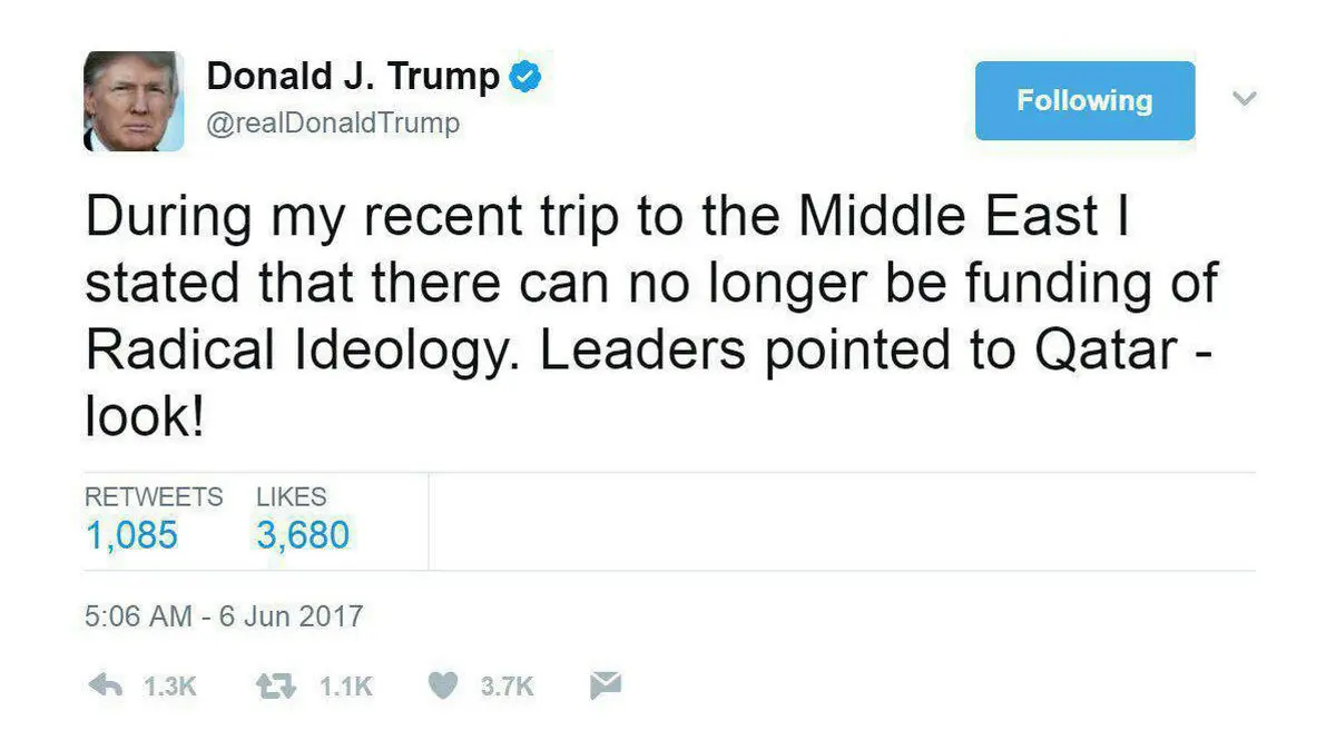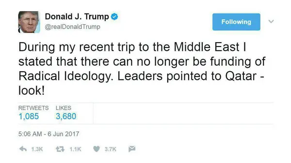 رکنا: ترامپ در توئیتر شخصی اش پستی درباره بحران قطر منتشر کرد.