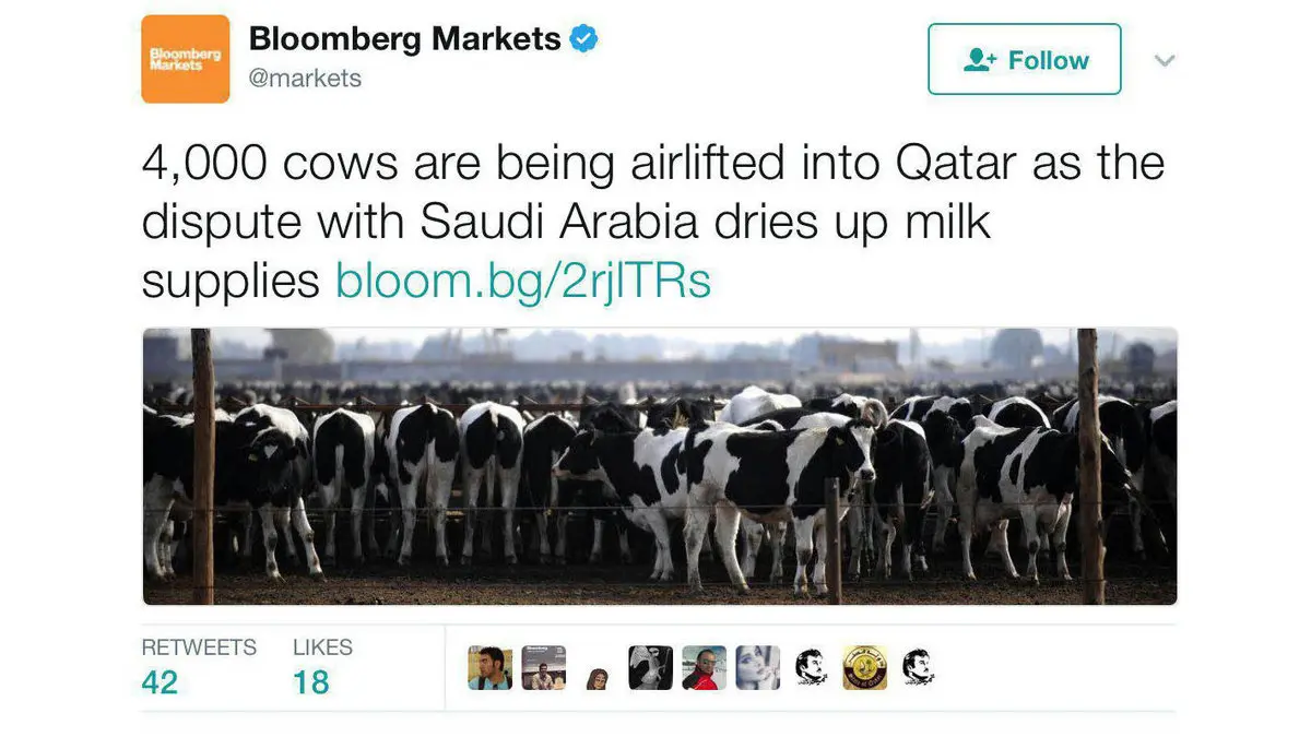 رکنا: تاجر قطری برای قطع نیاز این کشور به شیر وارداتی از عربستان 4000 راس گاو را با 60 پرواز از استرالیا به قطر منتقل می کند.