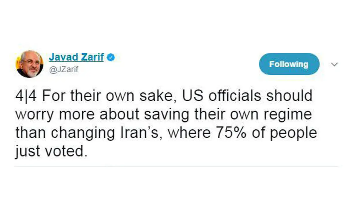 رکنا: وزیر امور خارجه ایران در توئیتر نوشت: برای آمریکایی ها بهتر است که بجای اینکه به تغییر رژیم در ایران که ۷۵ درصد مردم به صندوق رای اعتماد دارند فکر کنند به فکر حفظ رژیم خودشان در آمریکا باشند.