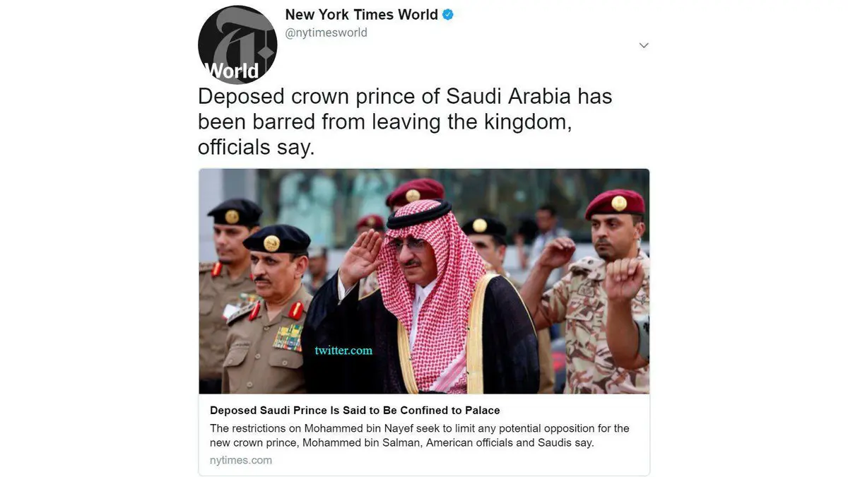 این روزنامه آمریکایی نوشت، بر اساس اطلاعاتی که از 4 مقام سعودی و آمریکایی نزدیک به خاندان حاکم عربستان به دست آورده، محمد بن نایف هماکنون در کاخ خود واقع در شهر جده در حصر به سر میبرد و اجازه خروج از عربستان را ندارد.