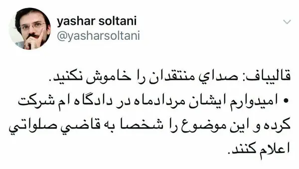 رکنا: یاشار سلطانی، خبرنگار معروف به سخنان قالیباف با یک توئیت، واکنش نشان داد.