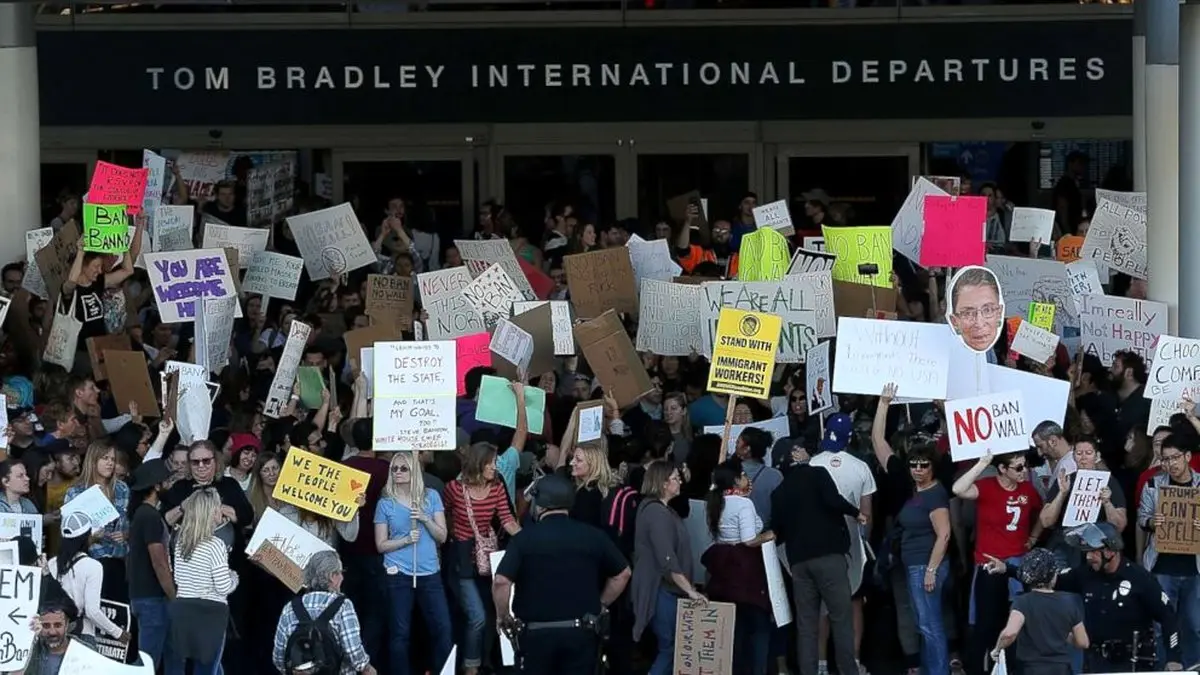 گروه زیادی از کارشناسان حقوقی و فعالان آزادیهای مدنی و نیز مردم آمریکا در اعتراض به اجرای مجدد فرمان ضد مهاجرتی ترامپ، در فرودگاه بینالمللی لسآنجلس تجمع کردند.