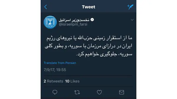 رکنا سیاسی: بنیامین نتانیاهو نخست وزیر رژیم صهیونیستی طی پیامهایی در توئیتر که به زبان فارسی نیز منتشر شد، با اعلام این موضوع که اسرائیل از یک آتشبس راستین در سوریه استقبال خواهد کرد، گفت: اما این آتشبس نباید اجازه استقرار نظامی به ایران و دستنشاندگانش را در سوریه و مخصوصاً جنوب سوریه بدهد.برای ورود به کانال تلگرام ما کلیک کنید.