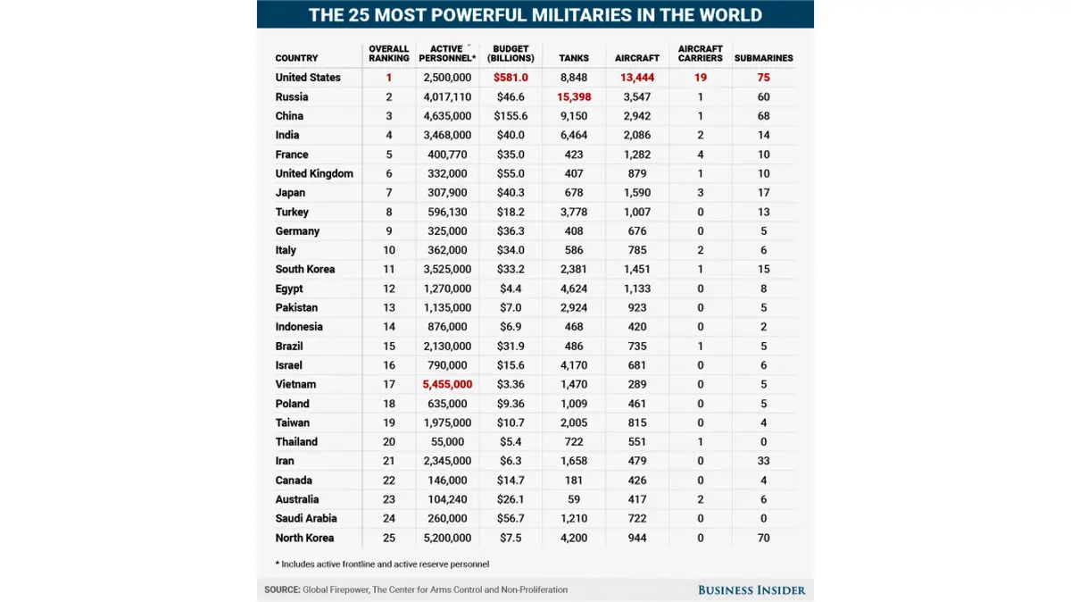 رکنا سیاسی: سایت رسمی گلوبال فایرپاور گزارش سالانه خود را درباره برترین قدرتهای نظامی جهان در سال 2017 منتشر کرد. برای این رتبهبندی، 50 معیار مختلف در نظر گرفته شده که ارتشهای جهان را با یکدیگر از لحاظ قدرت نظامی مقایسه میکند.