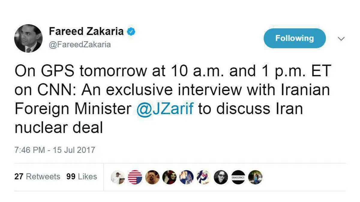 رکنا سیاسی: فرید زکریا خبرنگار سی ان ان در یک توئیت خبر داد: امروز ساعت 18:30 به وقت تهران با ظریف درباره توافق هسته ای گفتگو می کندبرای ورود به کانال تلگرام ما کلیک کنید.