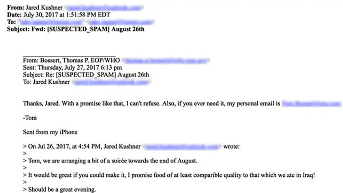 ایمیل جعلی برای «تام بوسرت»، دستیار دونالد ترامپ در امور امنیت داخلی آمریکا، ارسال شد و در آن آمده است: تا آخر اوت برخی مسائل را با یکدیگر هماهنگ خواهیم کرد. خوشحال خواهم شد این کار را برایم انجام دهی و من هم قول میدهم تو را به غذایی دعوت کنم که دستکم شبیه به آنچه در عراق خوردیم، باشد. مطمئنم به ما خوش میگذرد.