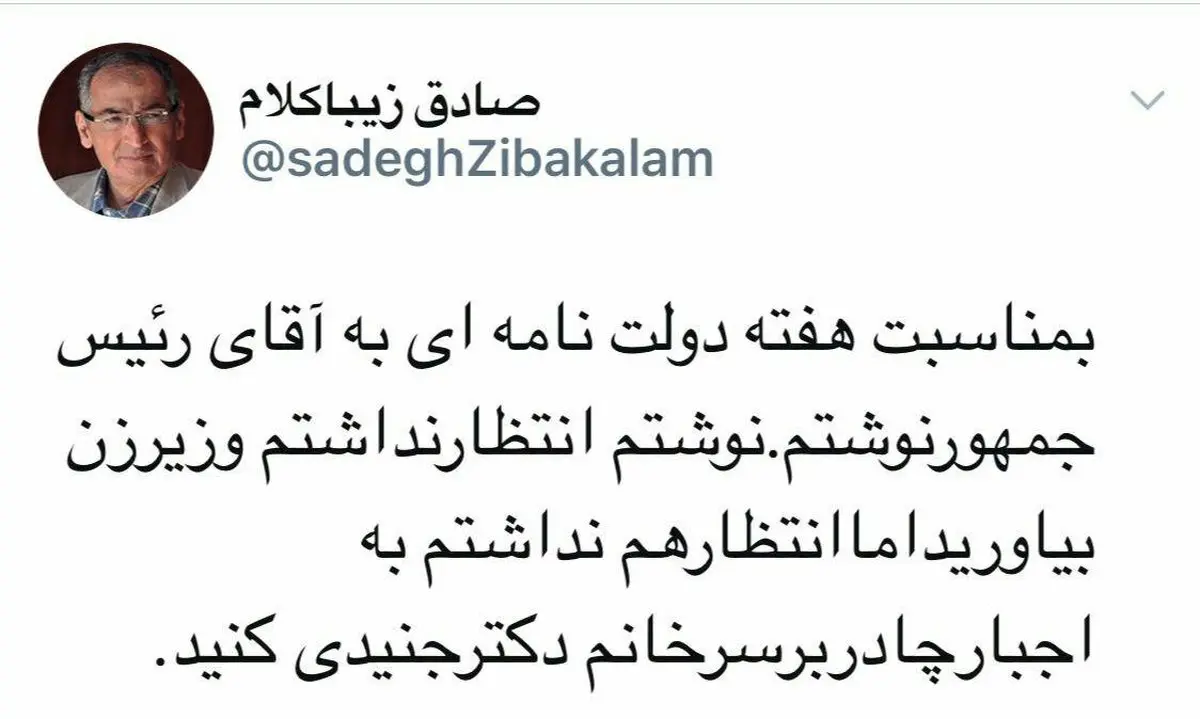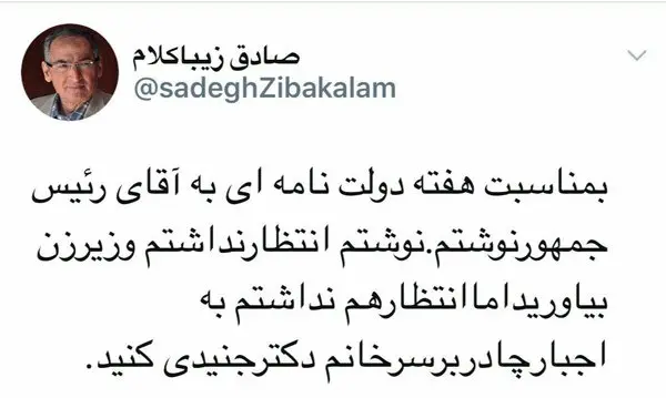 به گزارش گروه سیاسی رکنا: صادق زیبا کلام در یک توئیت تند خطاب به دکتر روحانی نوشت: به مناسبت هفته دولت نامه ای به رئیس جمهور نوشتم. نوشتم: انتظار نداشتم وزیر زن بیاورید اما انتظار هم نداشتم به اجبار چادر بر سر خانم دکتر جنیدی کنید.برای ورود به کانال تلگرام ما کلیک کنید.