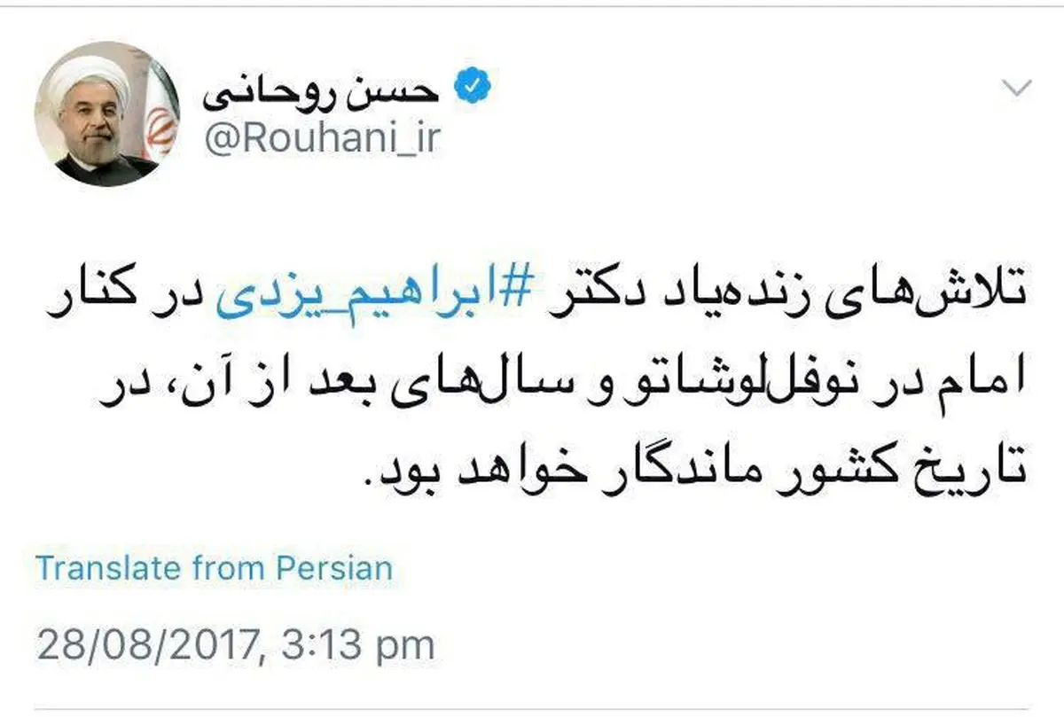 پیام حسن روحانی در توییتر به مناسبت در گذشت ابراهیم یزدی