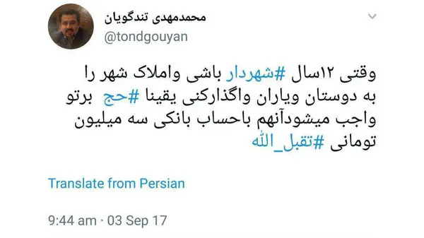 رکنا سیاسی: محمد مهدی تندگویان نوشت: وقتی دوازده سال شهردار باشی و املاک شهر را به دوستان و یاران واگذار کنی یقینا حج بر تو واجب می شود. آنهم با حساب بانکی سه میلیون تومانی. تقبل اللهبرای ورود به کانال تلگرام ما کلیک کنید.