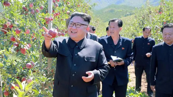 رسانه های کره شمالی تصاویری از رهبر 33 ساله این کشور در حالی که با چهره ای خندان در باغ های سیب این شهر قدم می زند و با کارگران صحبت می کند، منتشر کرده است.