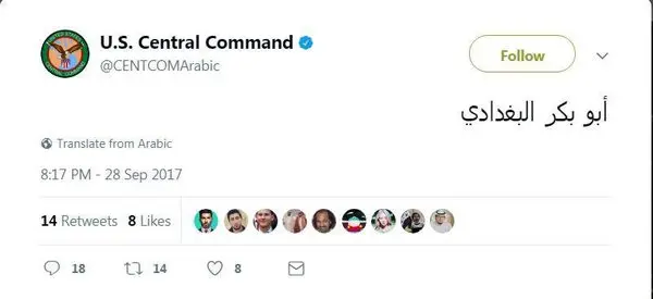رکنا: تصویری از توییت عجیب حساب کاربری فرماندهی مرکزی ارتش آمریکا همزمان با انتشار پیام صوتی ابوبکر البغدادی را در این خبر مشاهده کنید.